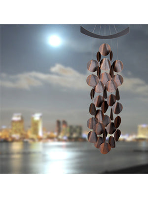 This chime has long strings that may tangle in strong winds. You may prefer to hang it in a sheltered area or indoors. SKU: MW Dimensions: 34 in. Overall Length Materials: Black finish ash wood, 34 antiqued copper finish steel disks.